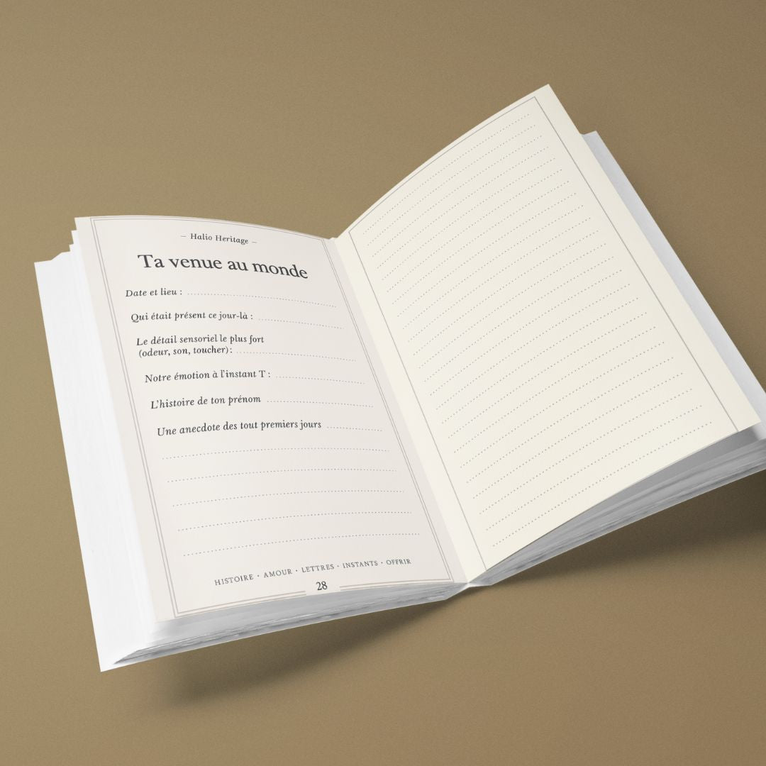 Parce qu’il ne s’agit pas d’un simple carnet. Reliure rigide premium, papier 120g anti-transparence, finitions haut de gamme : tout est pensé pour que le journal dure 18 ans et plus. C’est un héritage familial, pas un objet éphémère.